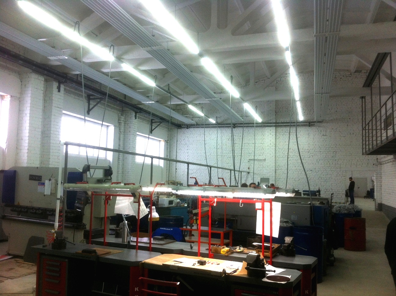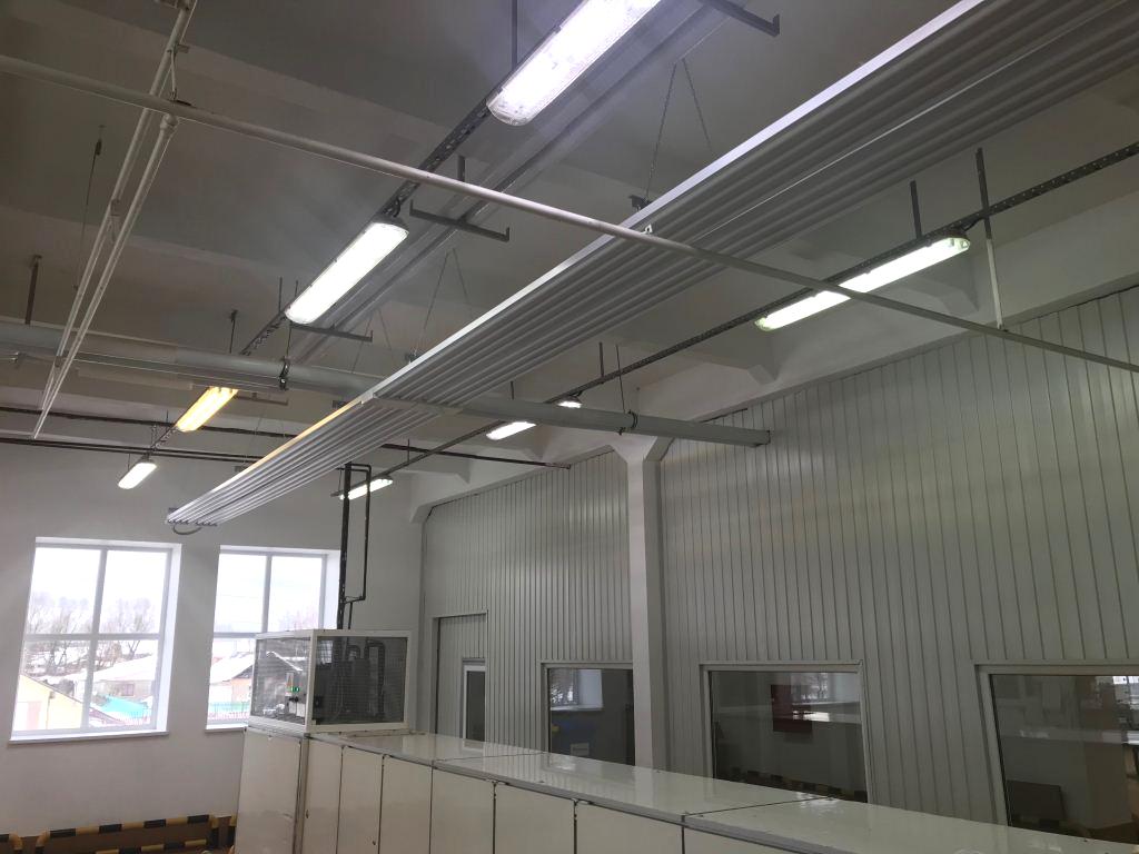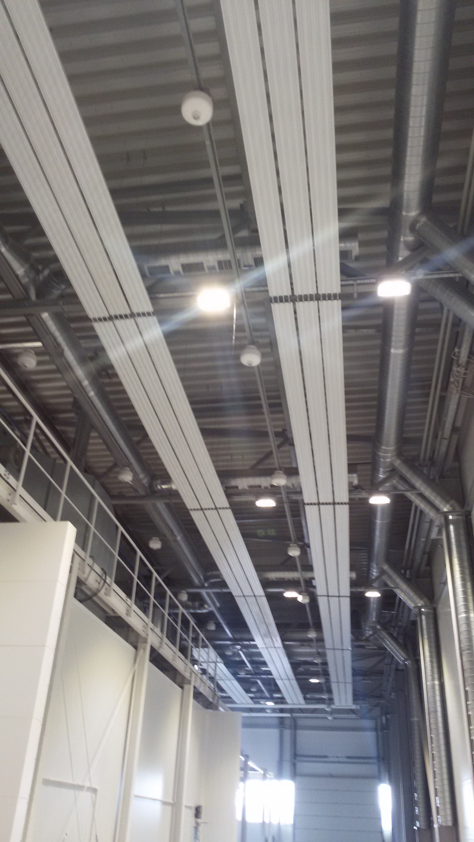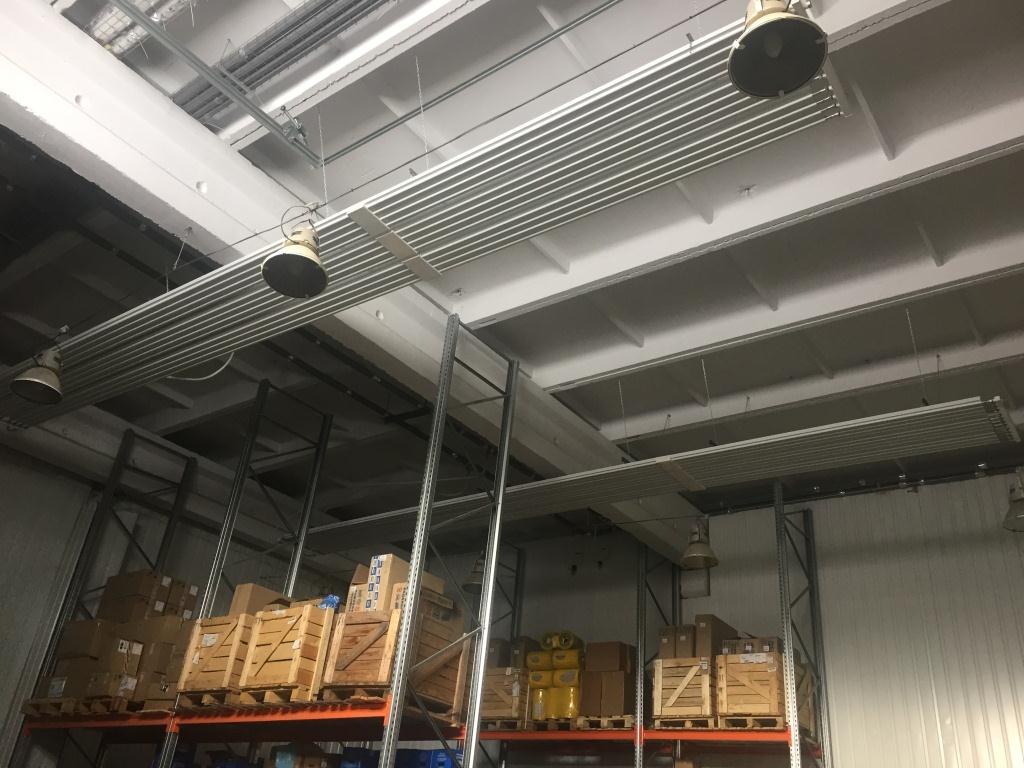 Установлено оборудование в супермаркете "СВЕТОФОР", города Тихорецк, Краснодарский край. Площадь отапливаемого помещения 700 м2. Высота подвеса панелей - 9 метров над уровнем пола.